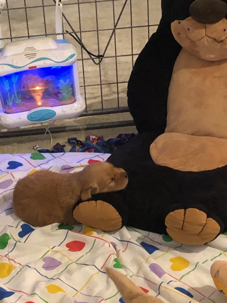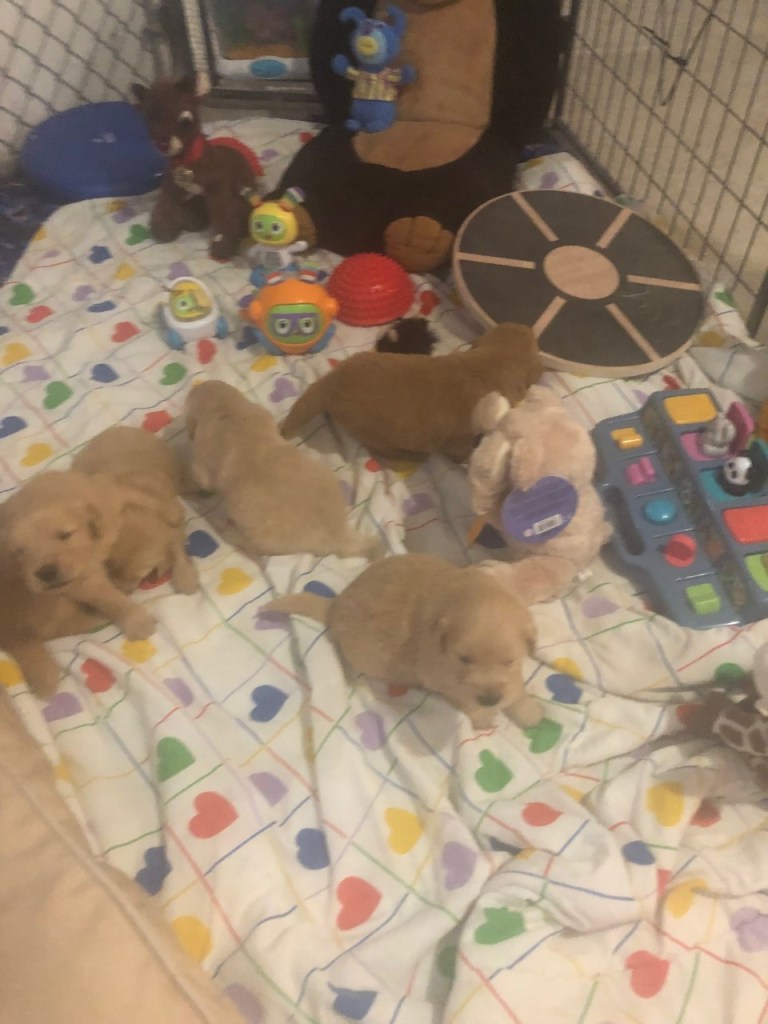 This week we’ve added Sights & Sounds play into our training regime. The aquatic conditioning and massage are continuing and with this new play experience, our days keep getting fuller and fuller! It’s been really interesting to make note of the different reactions the puppies have to the noise and light stimulation. The best was Miss Pink who sat next to a piano which was on continuous play mode and she put her little head up and started howling along with the music. Of course, no phone in my hand and the moment was over by the time I got the record button pushed. Some of the puppies crawl all over the toys making the sound or lighting up, others just sit and watch and there’s even a few who don’t seem to care one way or another that anything extra is happening. All of it is being recorded and noted and is giving us more clues into who each of them is. We will have our personality scent testing report cards back any time now too, and then we can start really shaping individual temperament. Our calm pups will learn how to become more alert and our excited puppies will learn strategies on calming down.