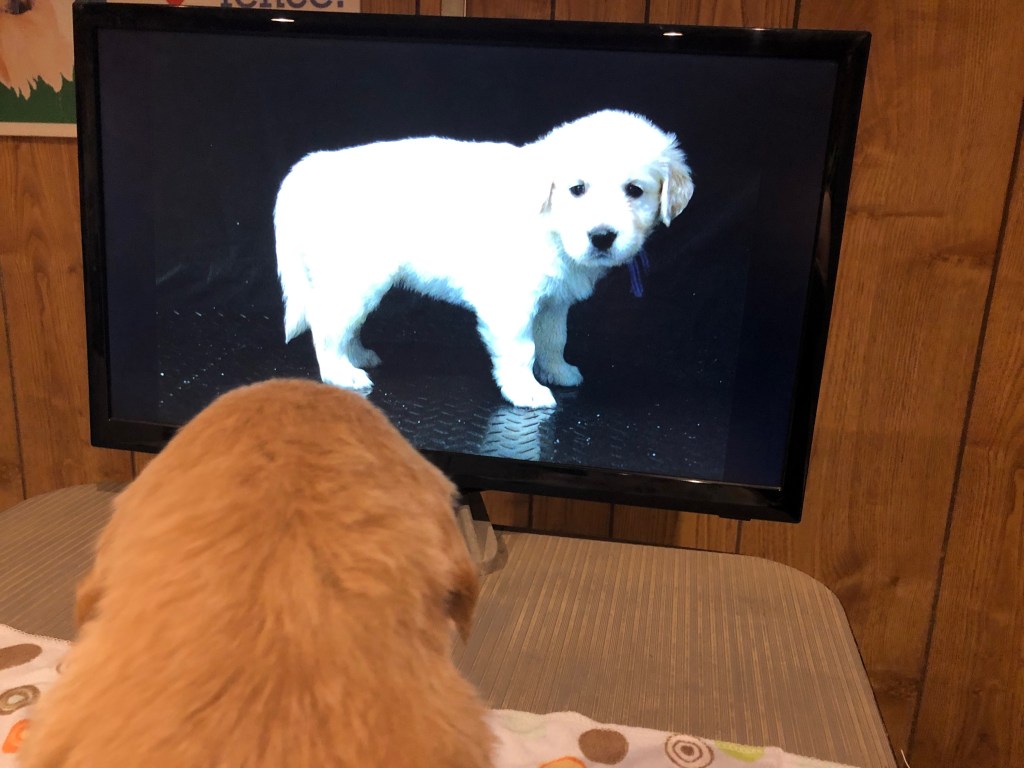 My kids will be more than willing to tell you that I don’t like them to have a lot of screen time. I believe unstructured time, using their imaginations and moving around in and outdoors is the ideal way for them to grow and learn. I did not buy into digital games and toys that supposedly helped my kids learn… we simply shut off the TV and went outside to play and explore. So, imagine their reactions to me when I tell them I’ve just finished TV time with the puppies- teaching them to learn how to sit, lay down and stand up. In fact, my youngest’s response was actually something to the tune of ” No fair, the puppies get to watch TV & learn stuff and you’re ok with that but you sure don’t let me do that.” Well… this is partly true. One of the ways that puppies learn is by imitation and repetition. So, I could repeatedly ask one of our older pups to sit, lay down or stand up, all the while holding one puppy at a time while keeping its attention on the dog… but I likely don’t have to explain how difficult and tiresome this would be. The founder of the Empowered Puppy Program actually developed the idea to record puppies in a series of short videos acting out these different positions, and she found that by watching the videos of them for several days in a row, the puppies learned the commands much quicker than puppies who were taught only verbal commands and hand signals. Many puppies have the “sit” command figured out by day 5 of watching the video! These little pups will have a head start on their training long before they go to their new homes J In defense of my own rule about less TV and more unstructured, imaginative play… Puppy School is only a short amount of time each day for the puppies. They’re getting the majority of each day to be dogs and explore, play, sniff, and chew! It’s all about balance J